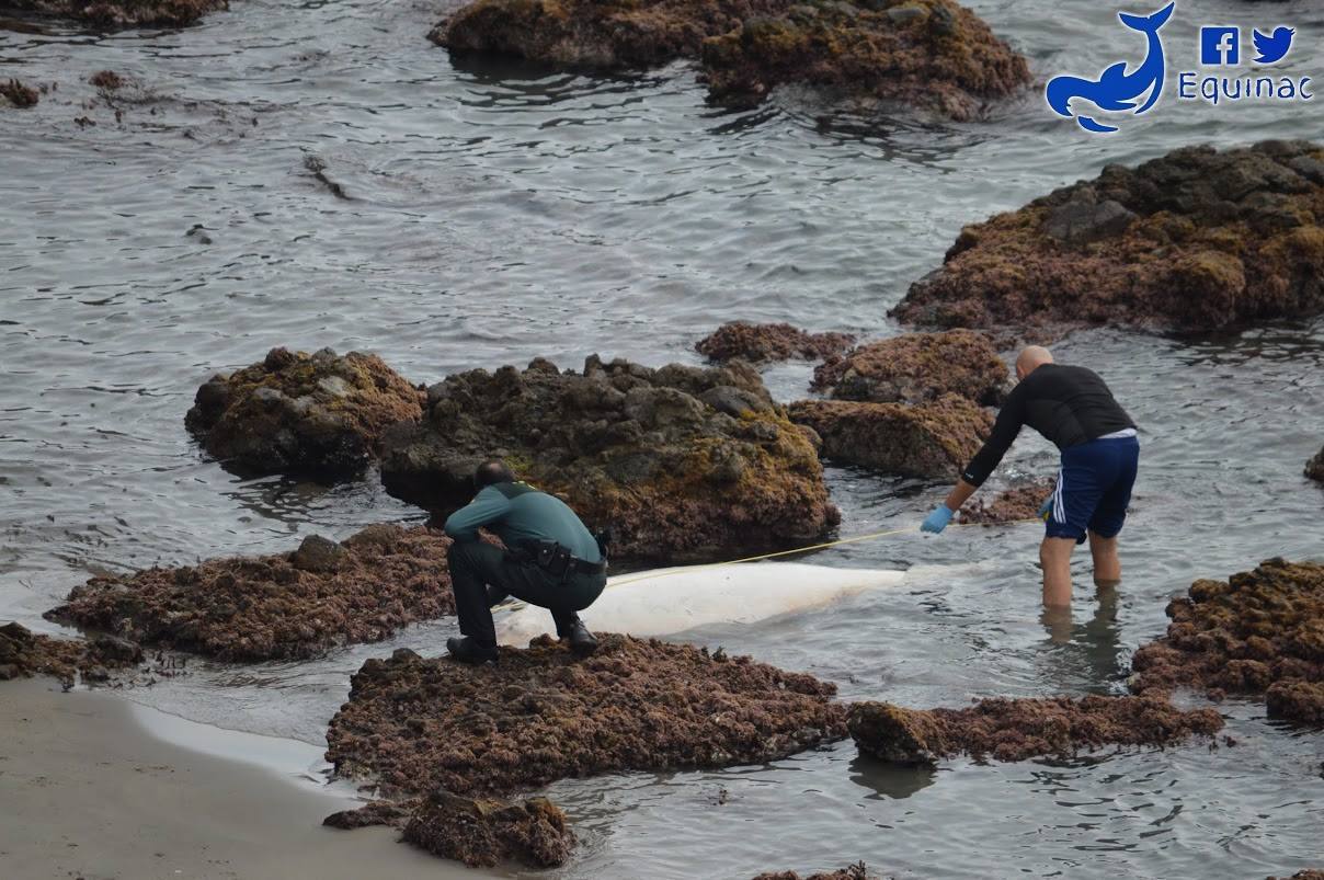 Voluntarios de la organización ecologista Equinac, especializada en acciones relacionadas con la fauna marina, rescataron ayer el cuerpo sin vida de un calderón gris (Grampus griseus) que apareció varado en una cala cercana a la playa de los Genoveses en el Parque Natural Cabo de Gata-Níjar. El rescate del cadáver, en el que colaboró un agente de la Guardia Civil, fue bastante complicado al ser una zona de difícil acceso por tierra. Según indicaron ayer fuentes de la asociación en defensa de la fauna marina, técnicos se desplazaron a la zona tras ser alertados por el Servicio de Emergencias del 112. Varios voluntarios y un agente de la Guardia Civil consiguieron llegar hasta la zona donde se encontraba el cetáceo y comprobaron que se trataba de macho de calderón gris de apenas tres metros de envergadura.