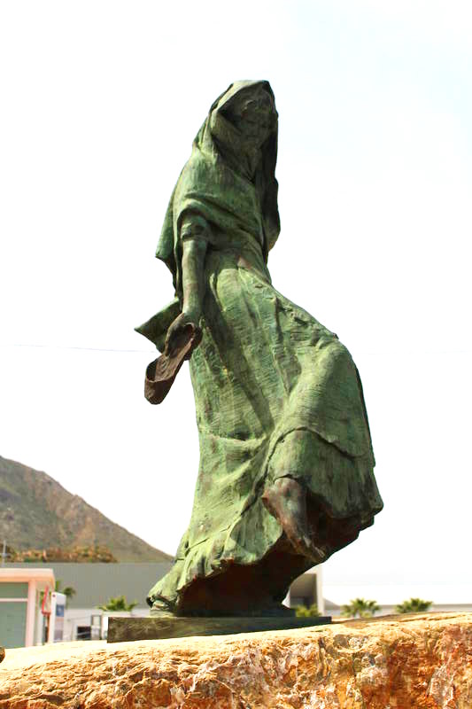 EstatuaDeLaMojaquera2Encontramos en Mojácar dos esculturas a modo de homenaje, una de bronce en la rotonda que hay frente al parking Rey Alabez y otra de mármol en la puerta de la Iglesia. La de mármol en la puerta de la Iglesia representa a la mojaquera que bajaba a por agua a la fuente con su cántaro sobre la cabeza.